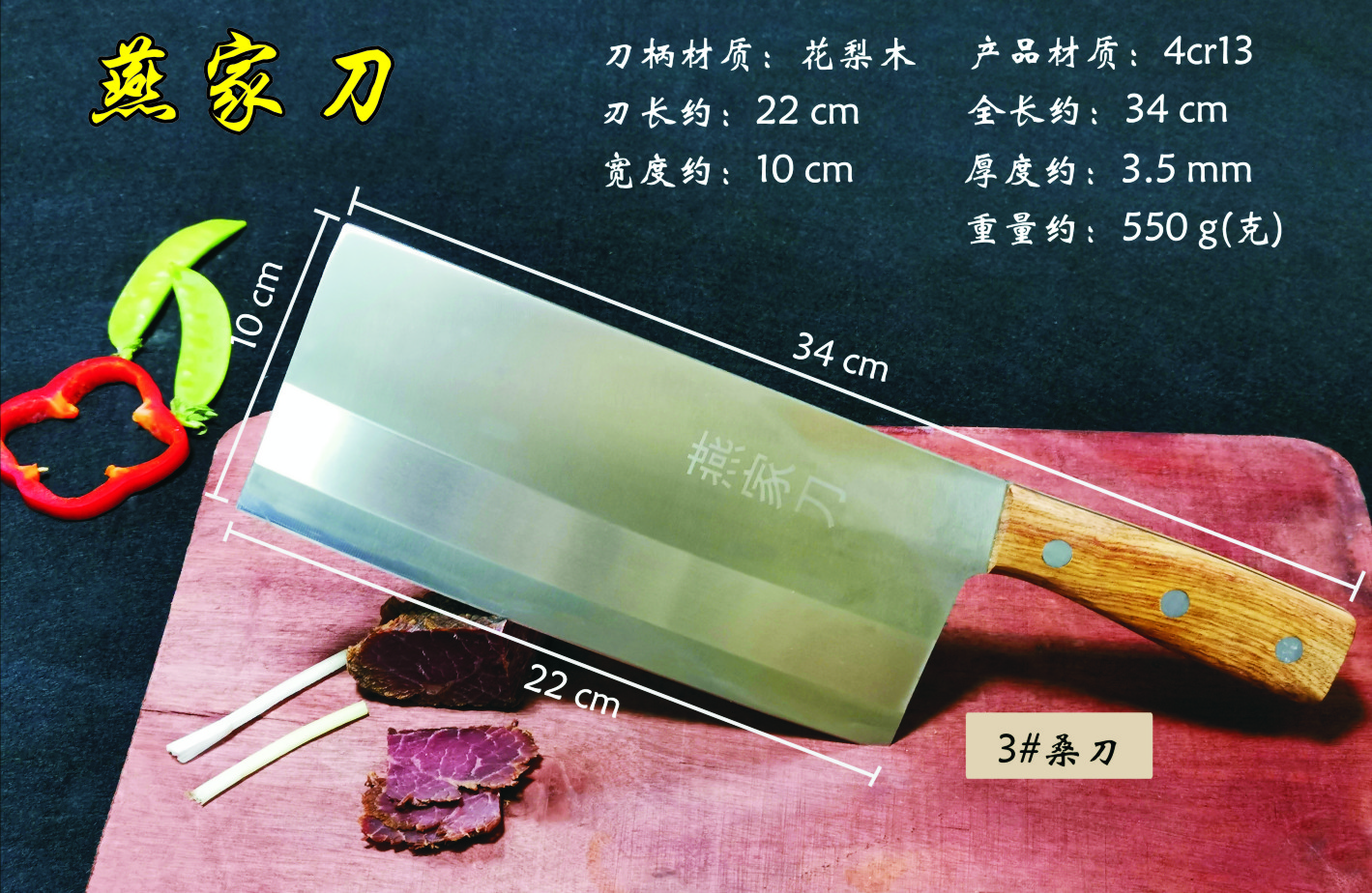 樂山燕家刀具有限公司(公司前身為燕佳鐵匠鋪),公司坐落于美麗的佛都之鄉樂山嘉州,在全國各地有上千家代理經銷點,公司專業銷售、設計、制作各類刀具。秉承一貫鍛造三精要求,即選料精、用料精、工藝精。所選材料全部產自滇東鐵礦優產區。本品牌刀具堅持千挑萬選為材,千錘百煉為刀的手工鍛造工藝宗旨。具有鋒利耐磨、持久耐用,用料上乘,硬度高、韌度強的特點!